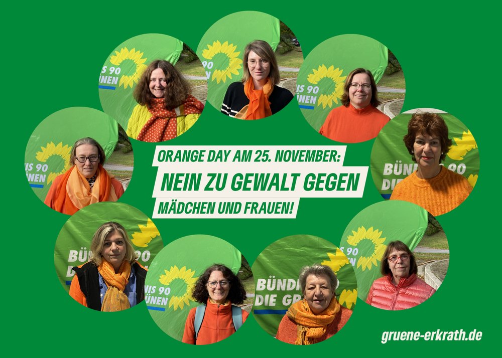 Die Frauen der Erkrather GRÜNEN setzen schon seit Jahren regelmäßig ein Zeichen gegen geschlechterbezogene Gewalt, unter der so viele Mädchen und Frauen in der ganzen Welt leiden. So regten sie z. B. vor zwei Jahren an, das Erkrather Rathaus orange zu beleuchten, um der von der UN initiierten Aktion "Orange The World" Aufmerksamkeit zu verschaffen.